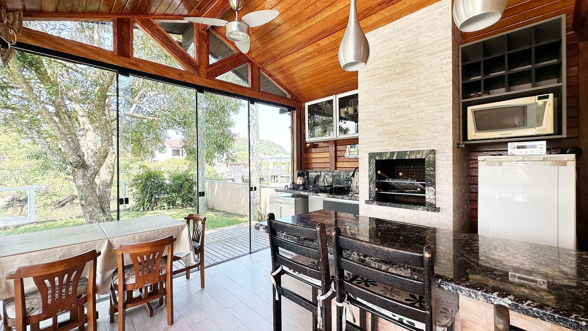 Conta também com ampla edícula climatizada com churrasqueira, banheiro social, sala de jogos contendo mesa de sinuca, pingue-pongue, carteado, TV por assinatura, varanda gourmet, lareira, quintal grande com piscina spa, prainha e rio nos fundos.